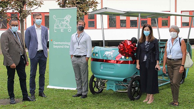 Segrate, 16 settembre 2020 – Lidia Cirillo, AD di LEO Pharma Manufacturing Italy, ha consegnato ufficialmente al Sindaco di Segrate, Paolo Micheli, il velobus donato da LEO Pharma alla comunità. Il velobus è un mezzo elettrico a pedalata assistita, totalmente ecologico e ad emissioni zero, pensato per il trasporto di 6 passeggeri più un accompagnatore.